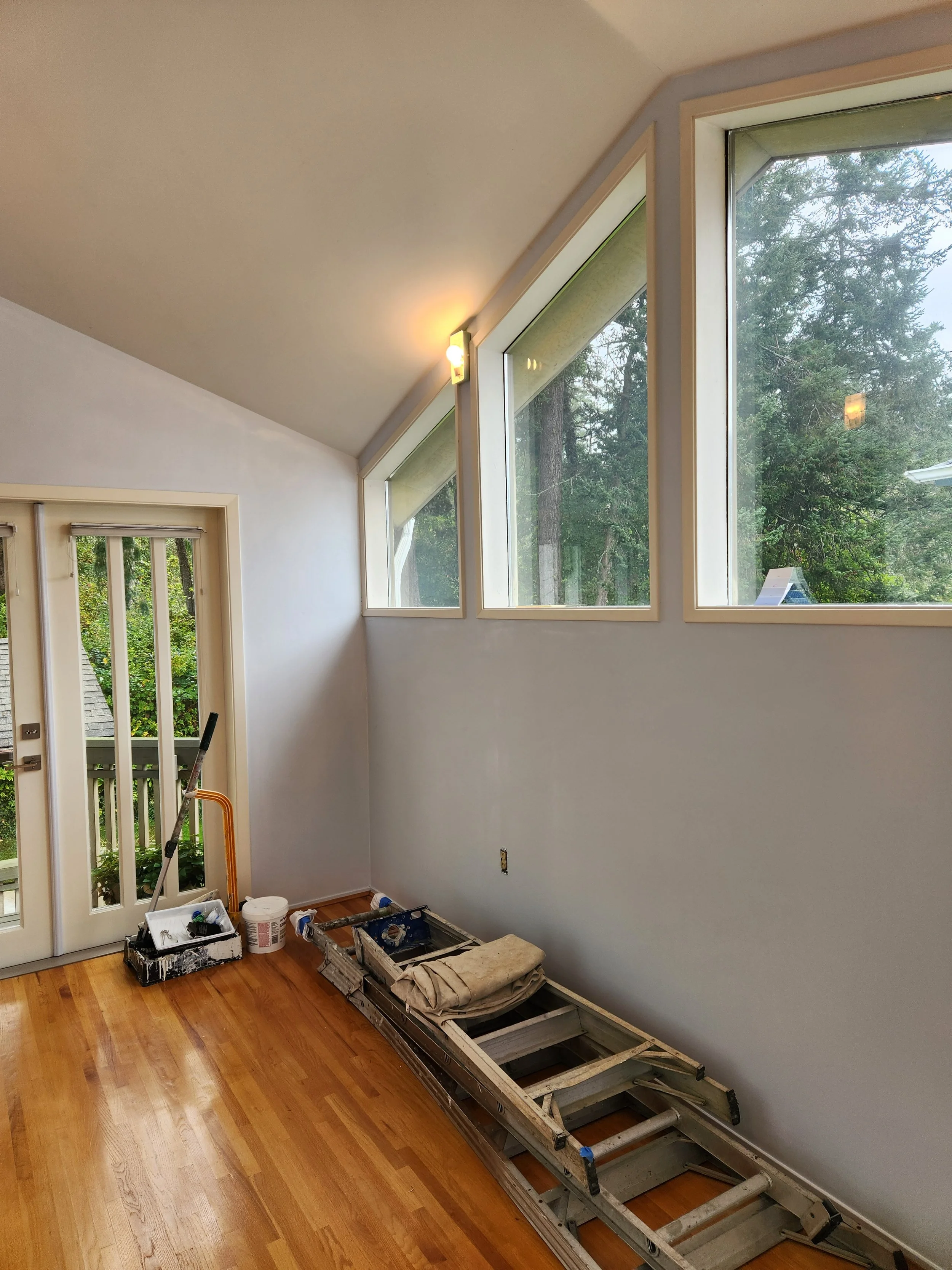 Colour changing paint work done in Colwood BC inside a home with large original wood trims and hardwood floors.