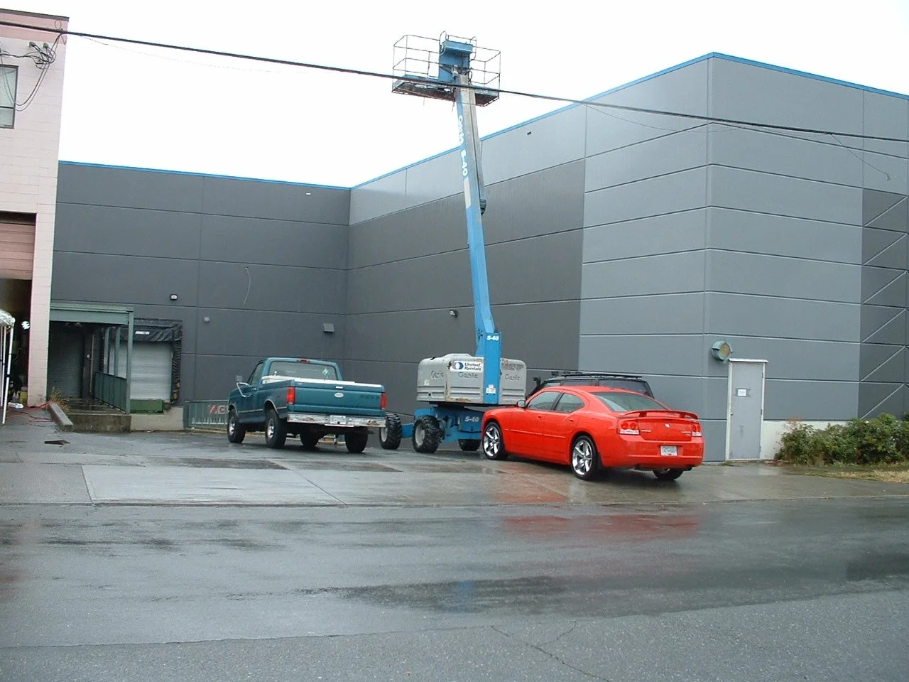 Early morning use of an airless sprayer to apply coatings to HVAC and galvanized steel in a retail construction site at the Mayfair shopping mall in Victoria BC.