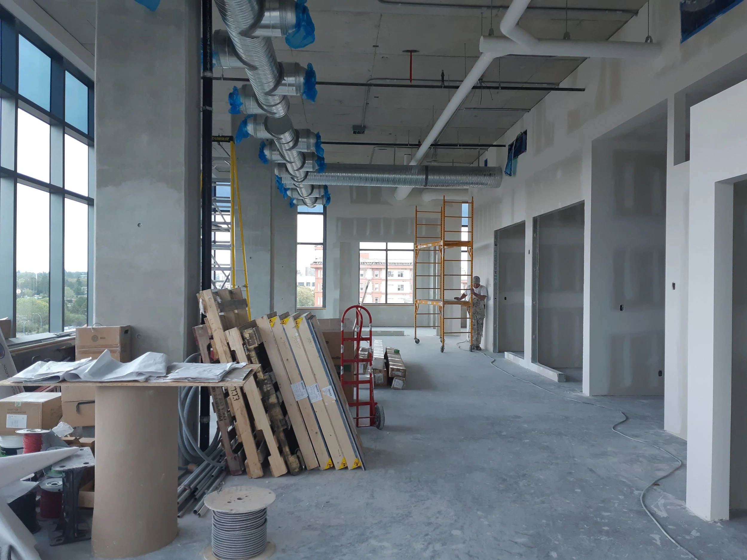 Interior view of a downtown Victoria BC office complex under construction, showing unfinished walls, exposed ductwork, construction materials, and our founder maneuvering a scaffold.